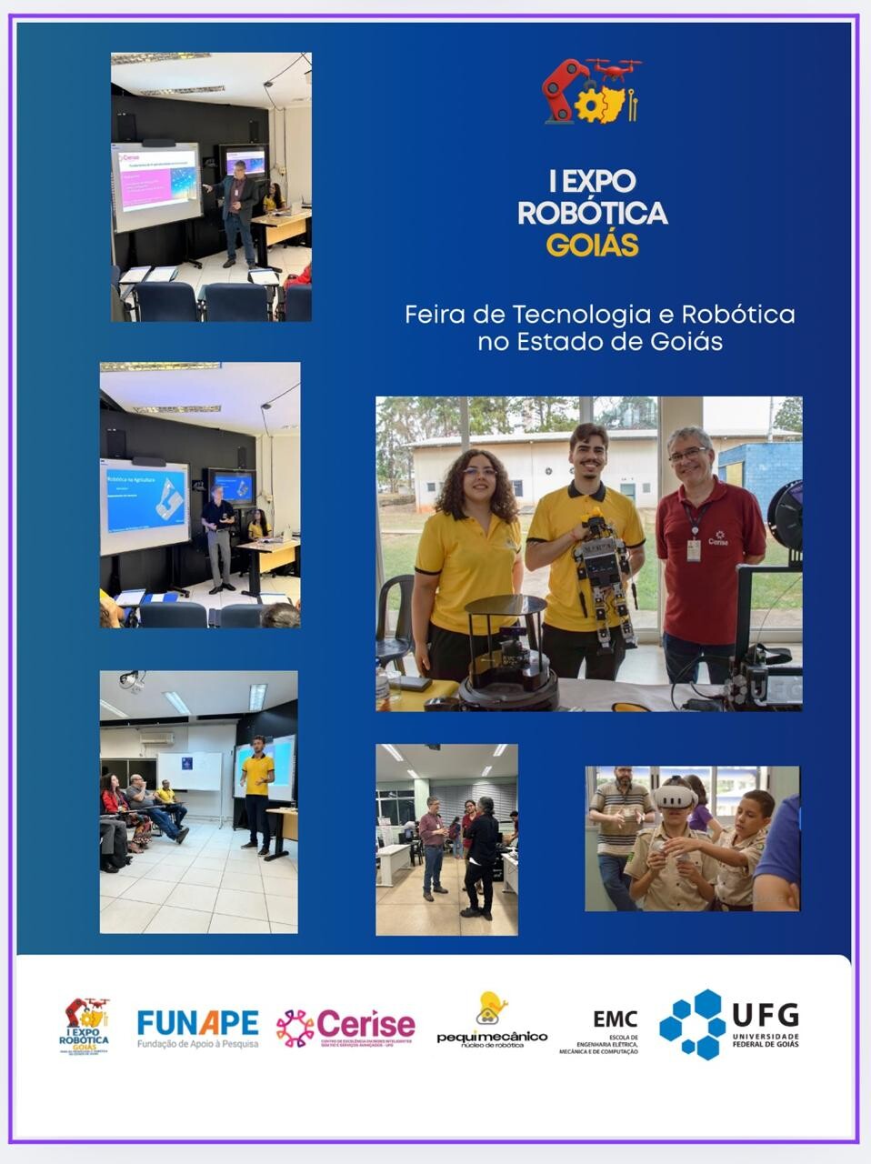 📅 No dia 29 de agosto, aconteceu a 1ª Expo Robótica Goiás – Feira de Tecnologia e Robótica do Estado de Goiás, um Evento de Extensão organizado pelo Núcleo de Robótica Pequi Mecânico UFG, pelo CERISE UFG e pela Escola de Engenharia Elétrica, Mecânica e de Computação (EMC UFG).